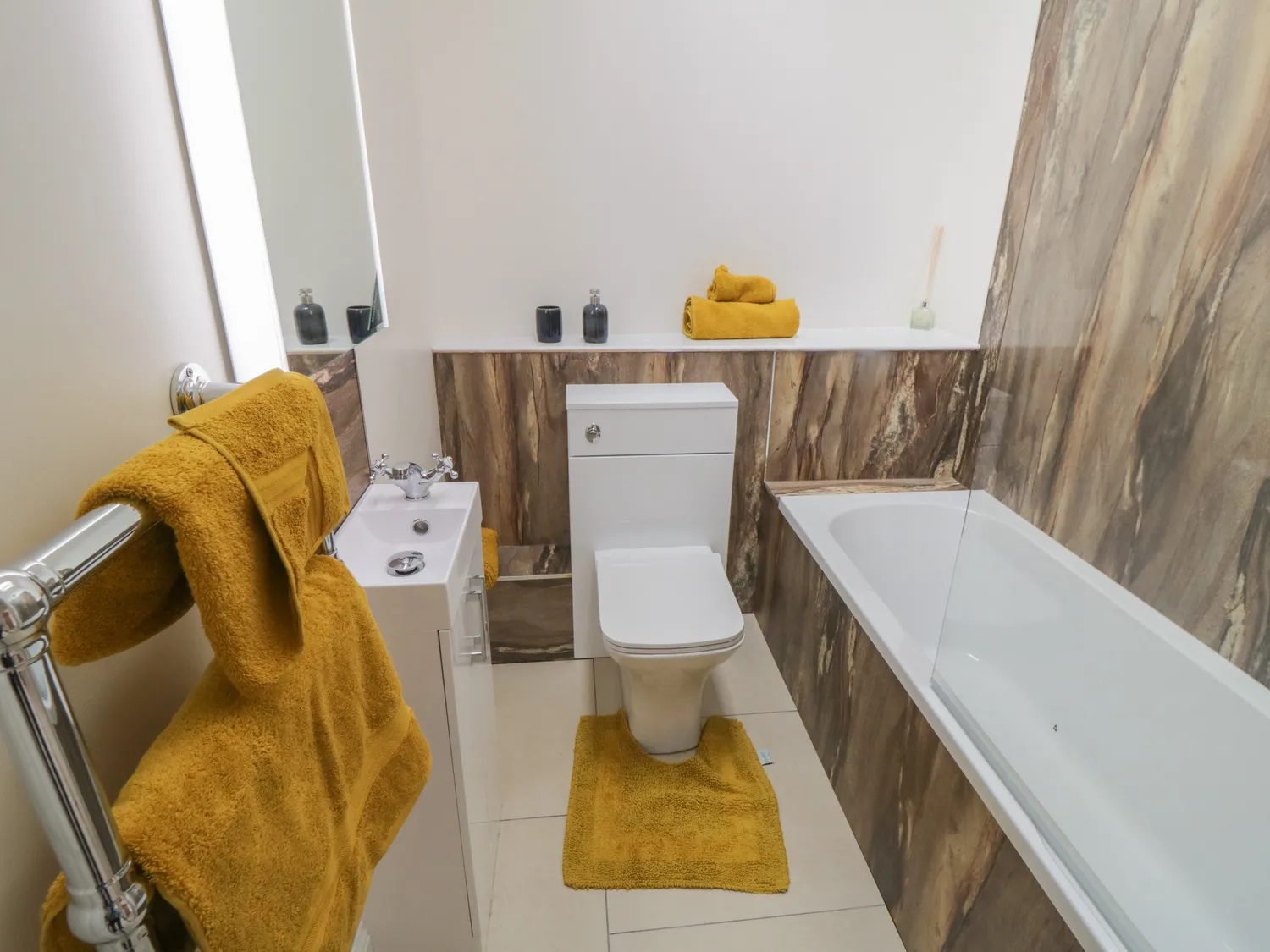 The bathroom is beautifully fitted with a bath which has a rainfall shower over it,